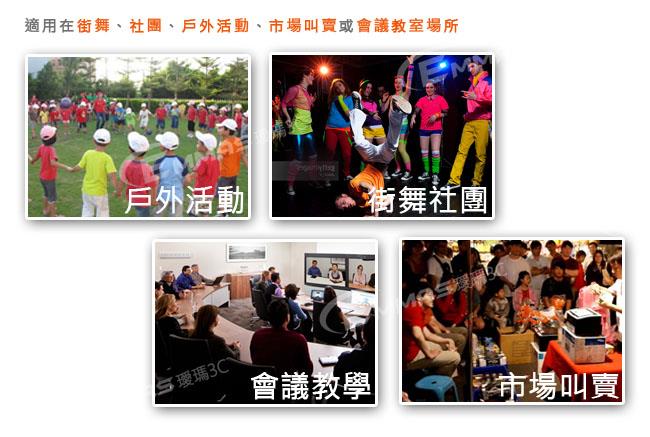 廣泛使用在 舞蹈社團、街舞、公園晨操、市場叫賣或百人以上教室場所