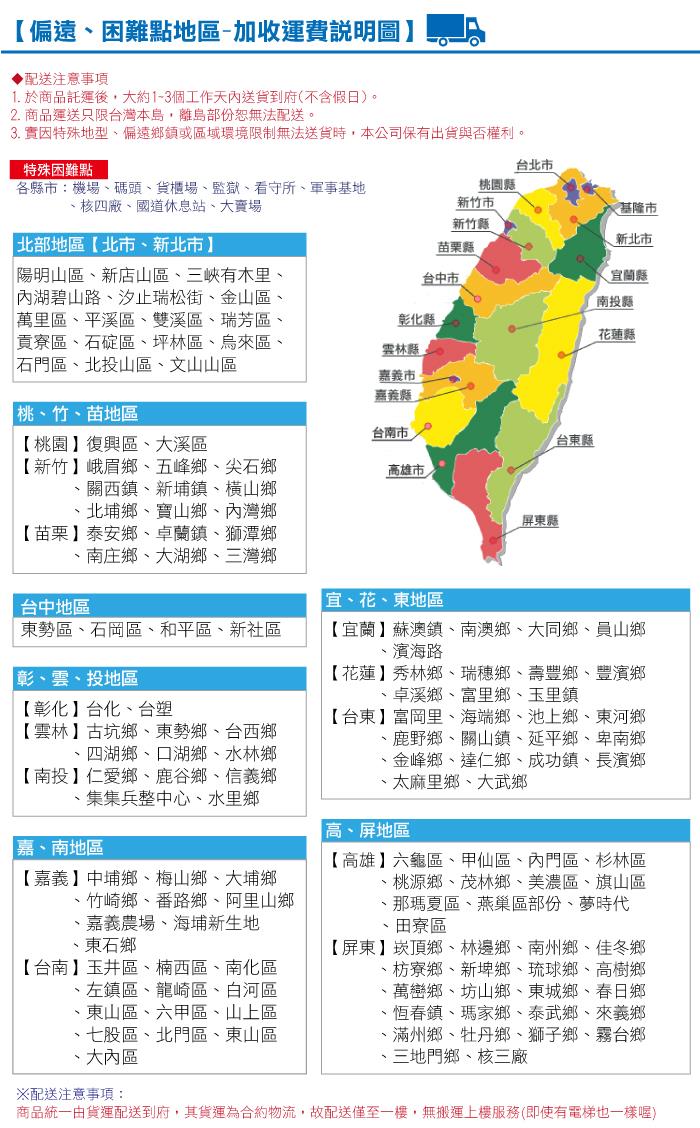 商品僅配送到收貨地址一樓,晚間及週日不配送,偏遠地區山區、離島地區暫無配送服務,敬請見諒。(偏遠地區之認定由本公司物流部核定)