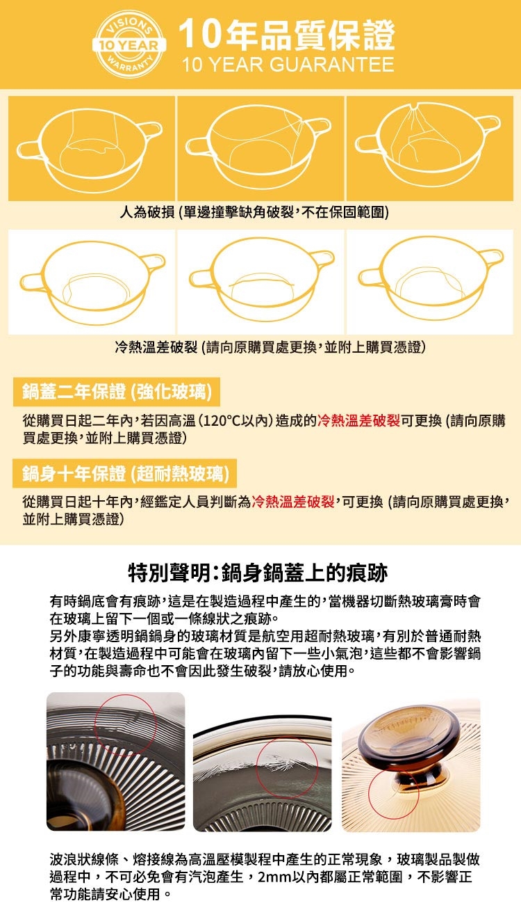 ●鍋身,十年保固,從購買日起十年內,若鍋身因冷熱溫差而破裂可免費更換。(更換商品請附購買憑證)
