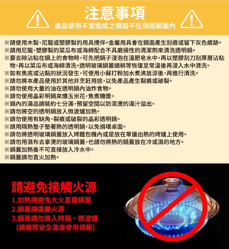 ●鍋蓋,二年保固,若因高溫(120度以內)而造成破裂可免費更換。 (更換商品請附購買憑證)