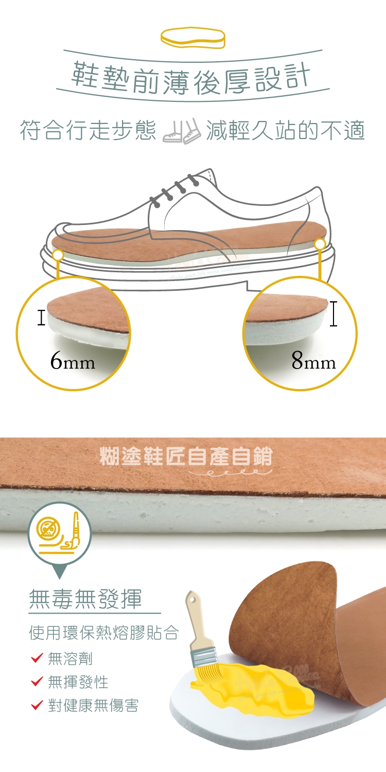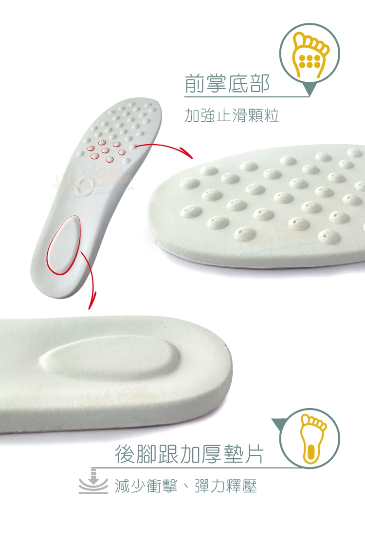 鞋墊前薄後厚設計,符合行走步態,減輕久站的不適