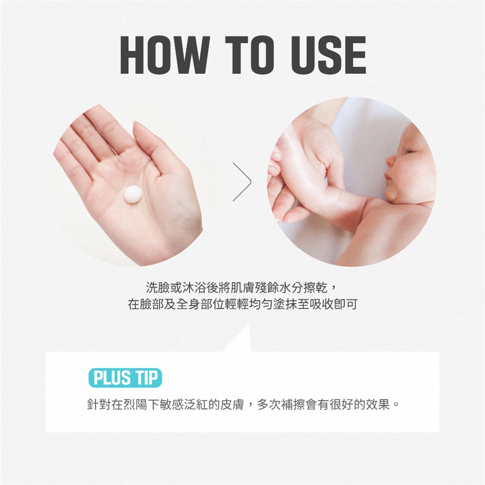 用法:請於洗臉或沐浴後,拭乾臉部及身體上的水分,取適量產品塗抹於臉部及全身並按摩至吸收。因日曬而不適的部位,建議隨時補擦。