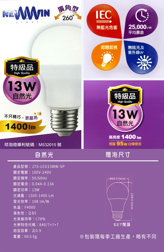 【NEWWIN】臺灣製 13W 全電壓LED廣角型球泡燈 (自然光) 4入1組