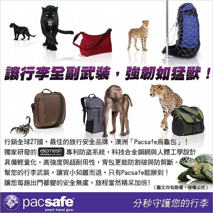 出國渡假前,你還為了確保行李安全煩惱嗎? 行銷全球的Pacsafe,保證讓您無後顧之憂,輕鬆樂遊行!是提升您出國旅遊安全的最佳選擇!"