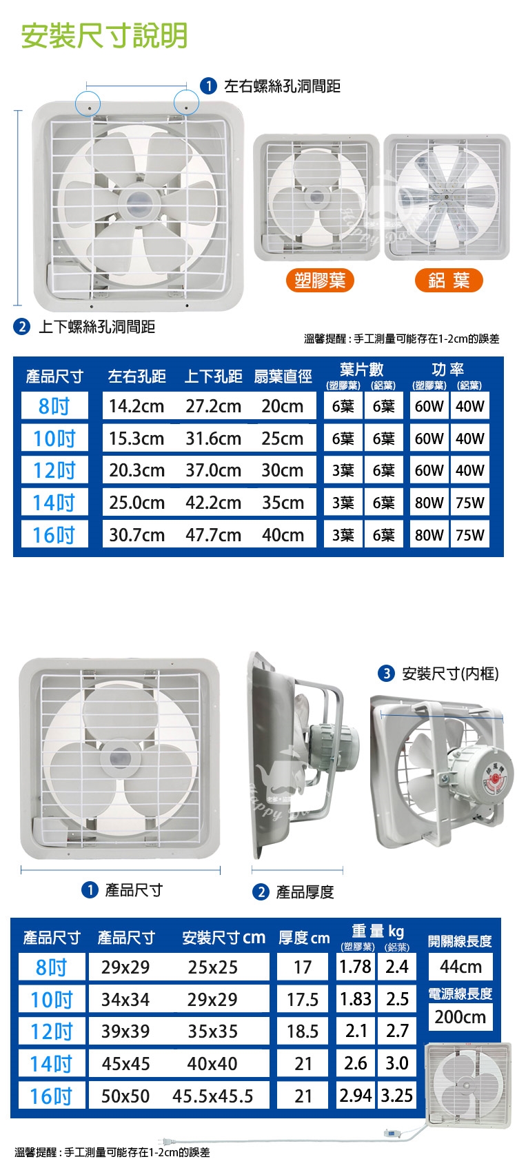 ◎ 8吋跟10吋是六片式葉片,12吋14吋16吋是3片式葉片,材質:PP塑膠