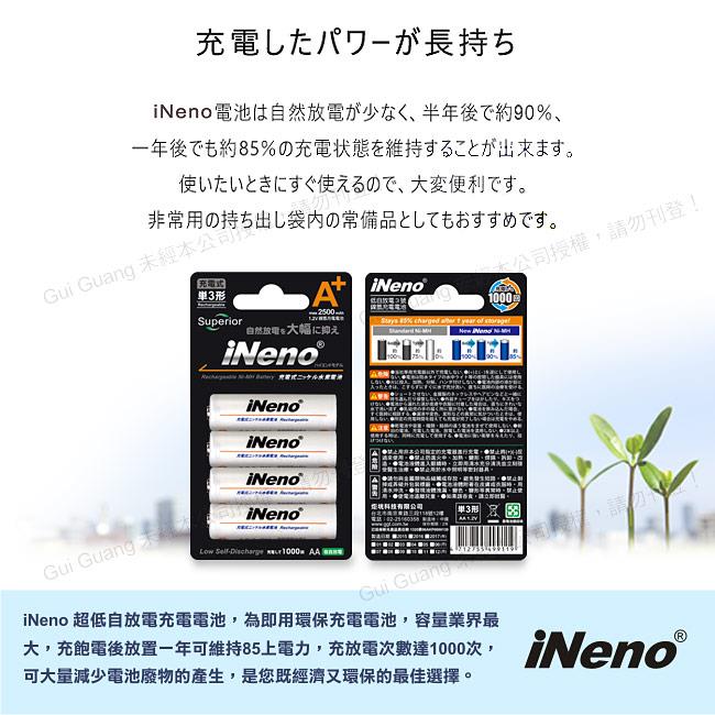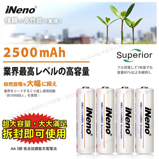iNeno低自放電3號鎳氫充電電池採2500mAh高容量設計,不但耗電量低,延長電子產品的使用時間外,電池本身還可重覆使用高達1000次,既省錢又符合環保概念。