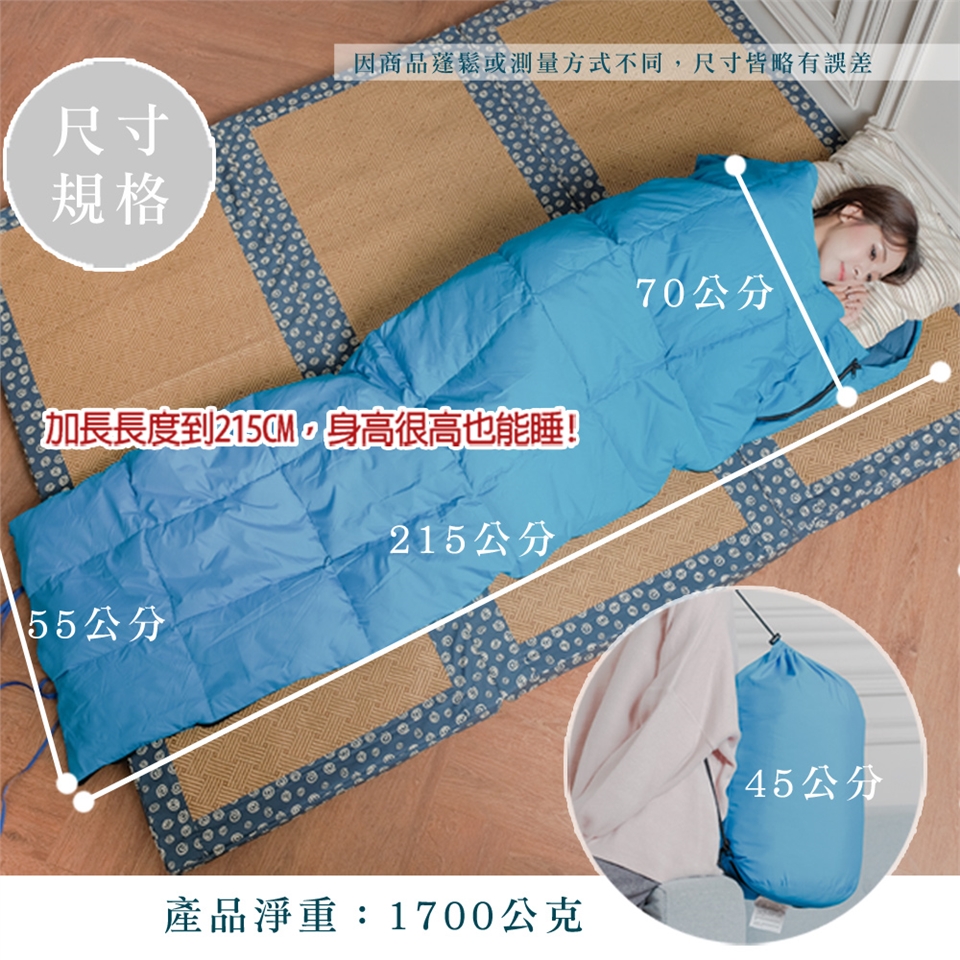 本產品特別加長長度到215公分,並使用雙拉鍊設計,讓您自由調節睡袋空間,自由伸展不拘束,野外露營包覆全身好溫暖。若是平常居家也可以將睡袋全打開當作客房的備用被,一物兩用方便又超值!整顆睡袋重量不到兩公斤,嬌小女生使用也輕鬆上手~