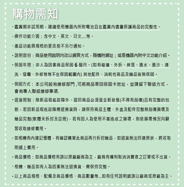 .鑑賞期非試用期,建議使用機器內所附電池且在10天鑑賞內盡量保護商品的完整性。
