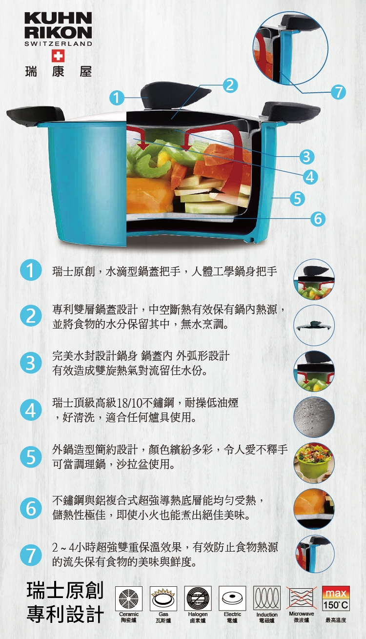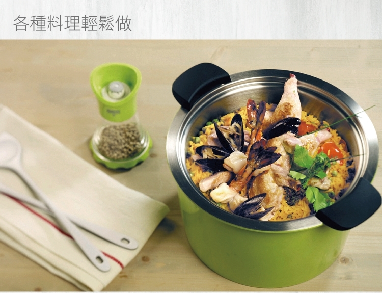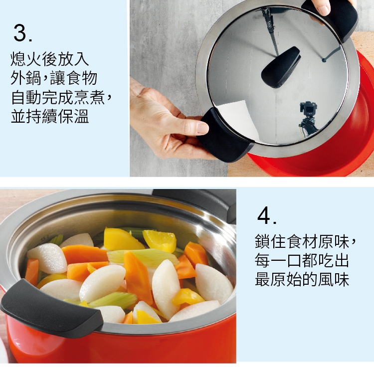 2.一般鍋子不同,有內、外鍋之分!內鍋是使用瑞士頂級高級18/10不鏽鋼,既耐操低油煙又好清洗,外鍋就更炫了,不僅色彩鮮艷,功能性更佳,具有二至四小時超強雙重保溫效果,防止食物熱源的流失