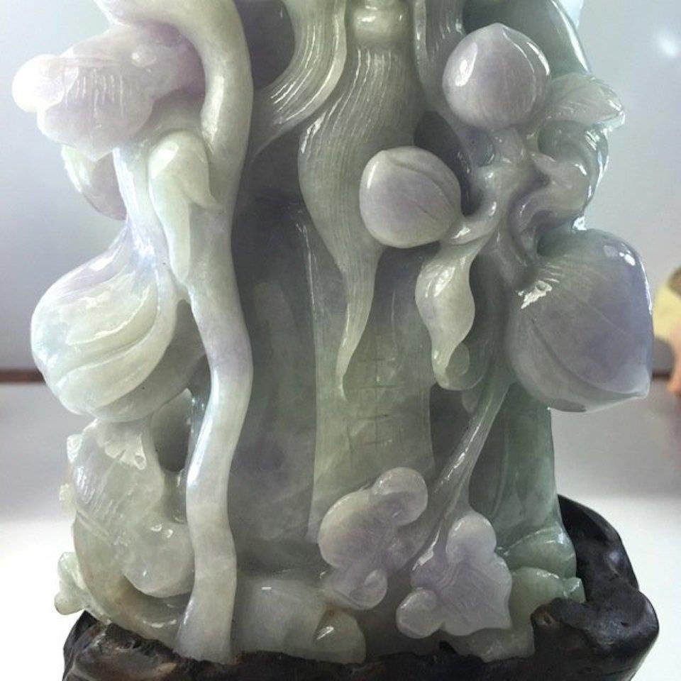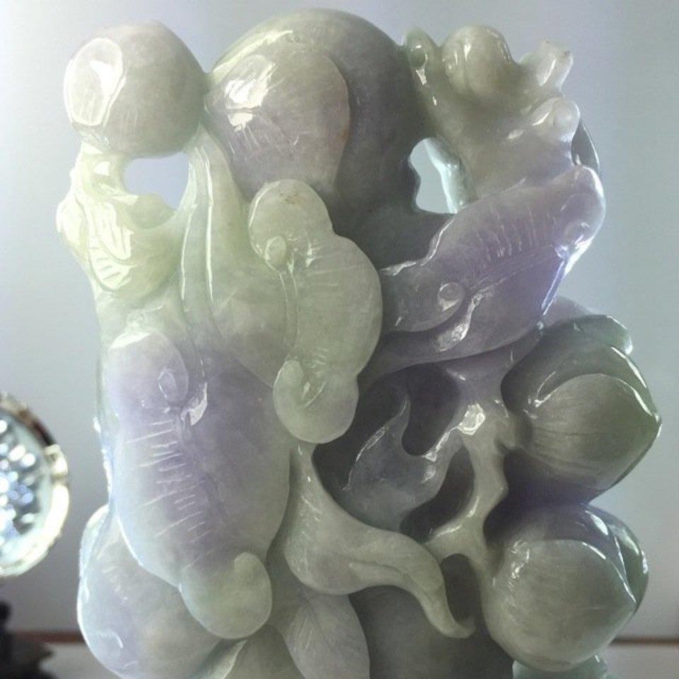 利用巧雕手法把紫色部分雕成壽桃和如意,雙面雕刻。