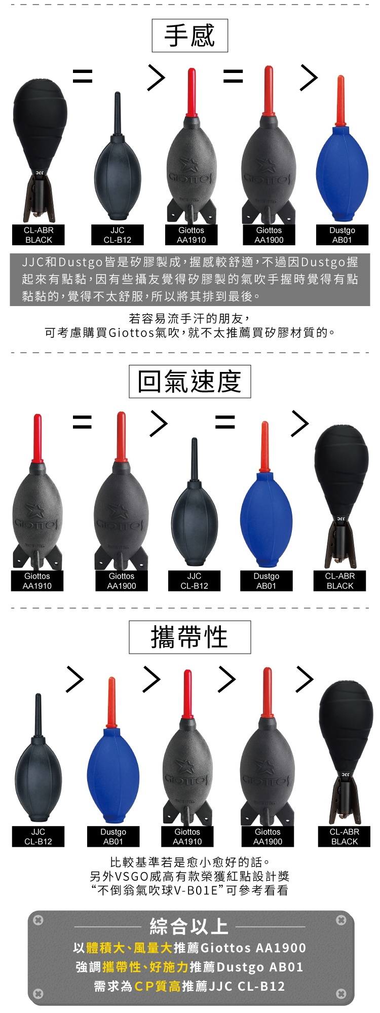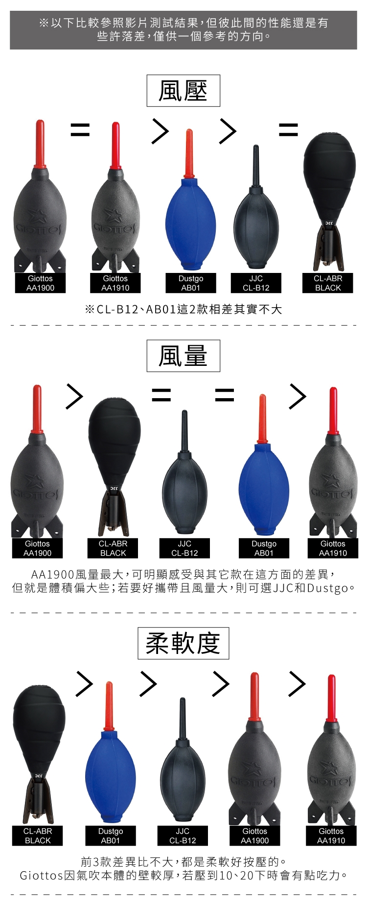 ●Giottos AA1910中型氣吹:風壓&回氣速度都排名第2且可站立。