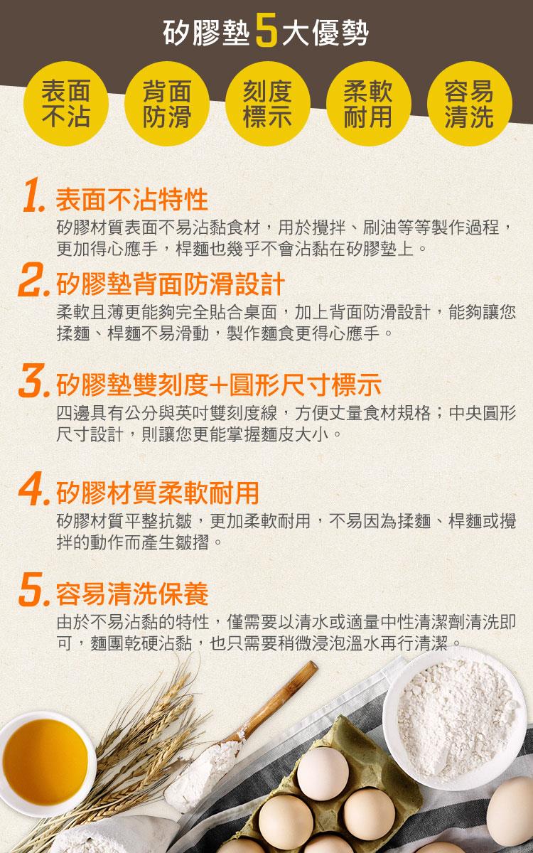 ◆表面不沾,擀麵時不撒麵粉也幾乎不會沾黏在墊上。