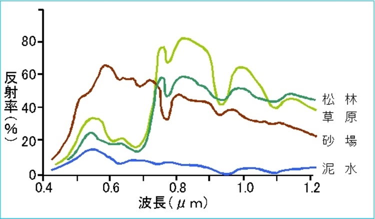 下面這張圖要說明的是松林、草原、砂場、泥水對不同波長的電磁波反射程度也不同。