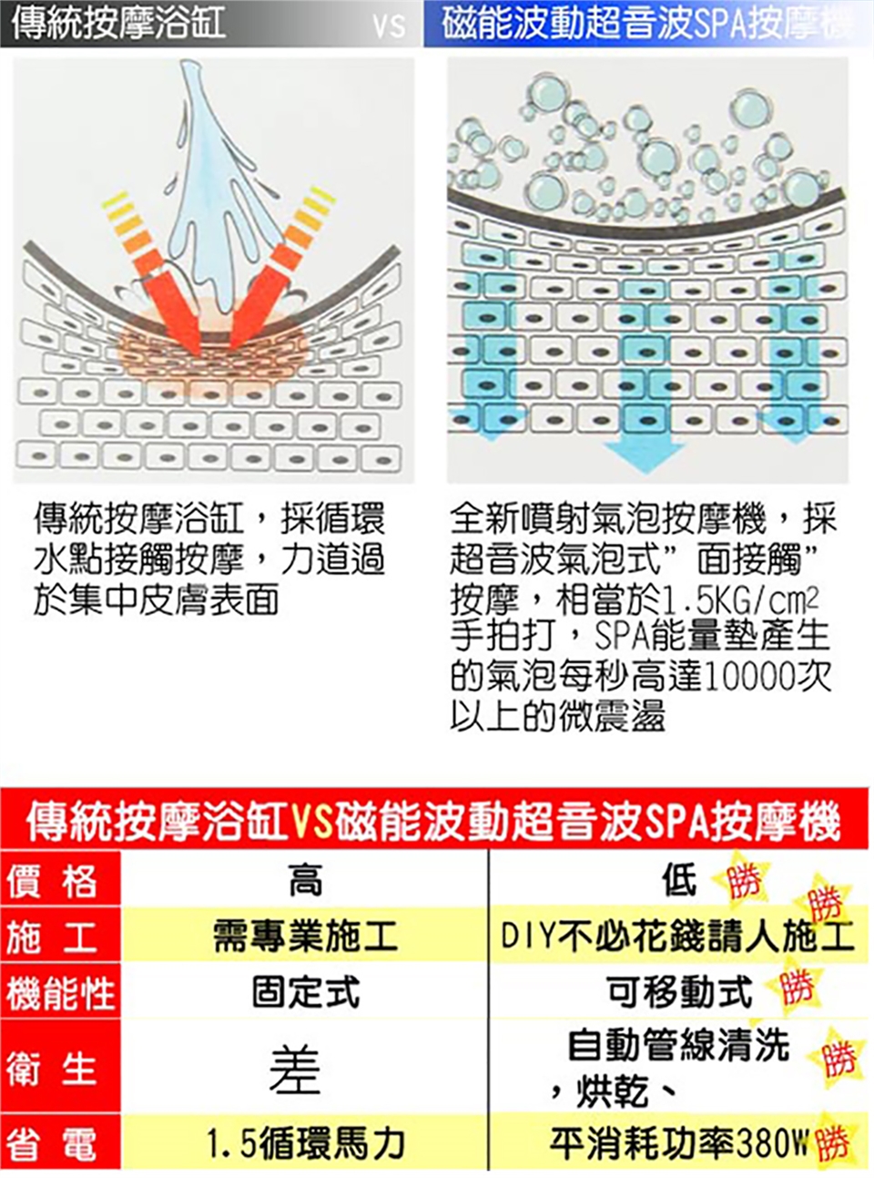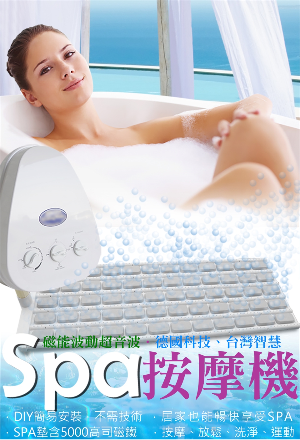 不需大費週章的施工換按摩浴缸,可保留原有浴缸,只要加裝磁能波動超音波SPA按摩機,在家就能愉悅的享受泡澡的樂趣,每天15分鐘的SPA沐浴,就能達到按摩、溫熱、洗淨、美容、運動、…等作用,產生前所未有的舒暢感。滿足現代人追求經濟、效率與健康的多種需求。