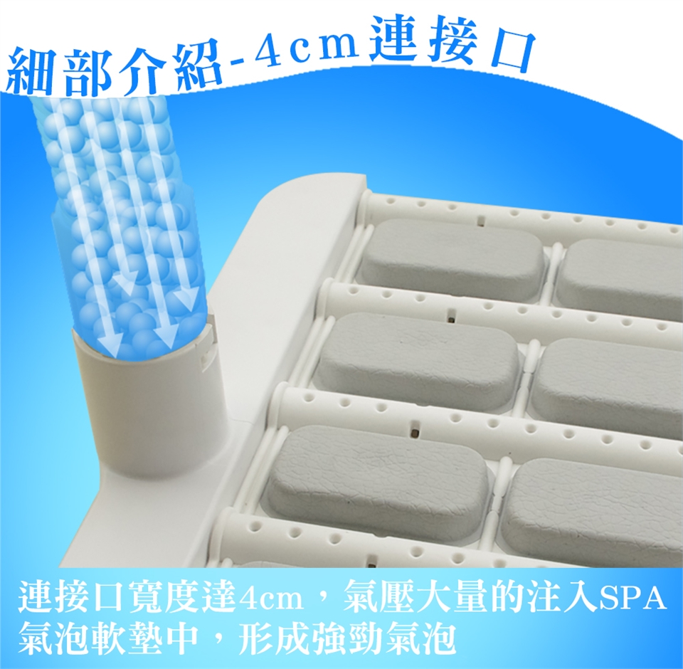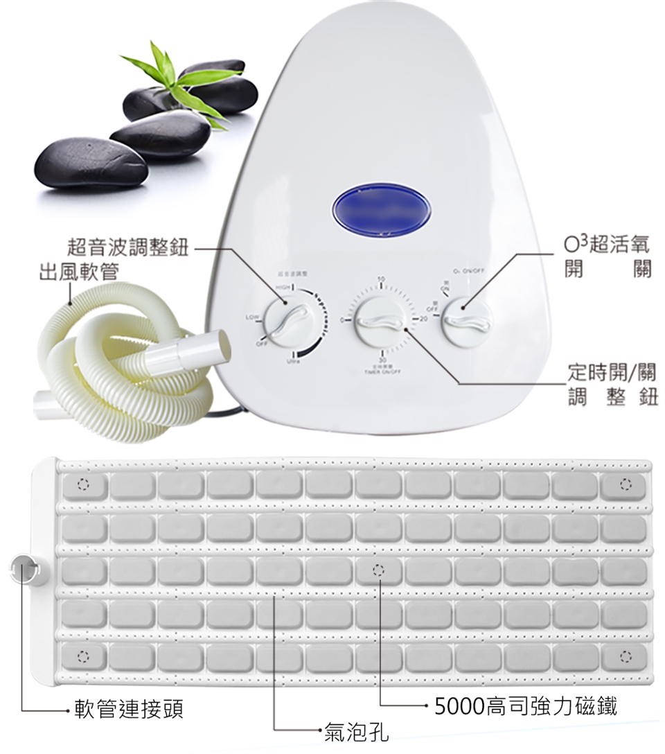 磁能波動超音波SPA按摩機,結合了德國科技與台灣智慧,採用最新研發的超靜音馬達及專利的空氣導流設計,搭配內建高科技磁石、遠紅外線、鈦、鍺等元素的超音波全能量氣泡軟墊,經由372個微小氣孔,高速噴出數百萬個強勁小氣泡,並瞬間連續於水中爆破,產生超音波能量,達到前所未有的泡浴暢快感。