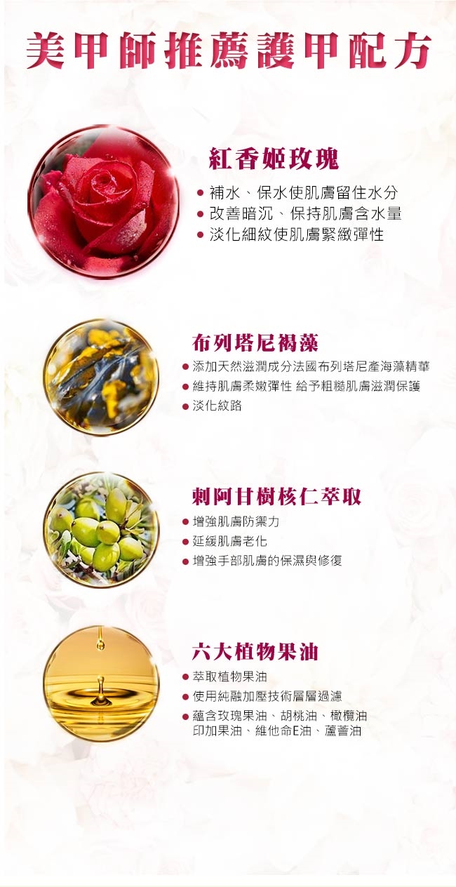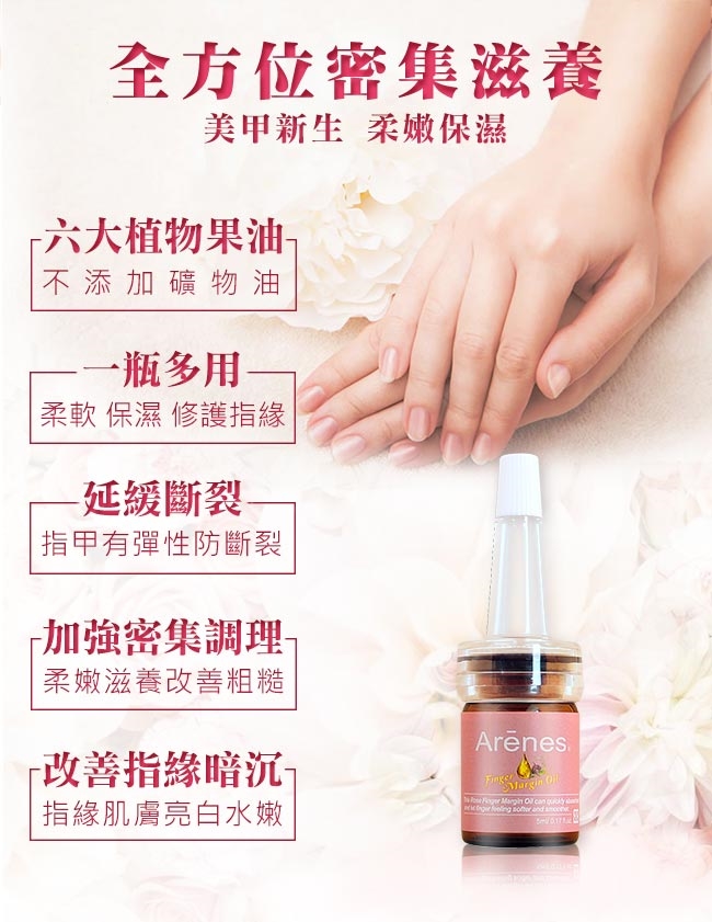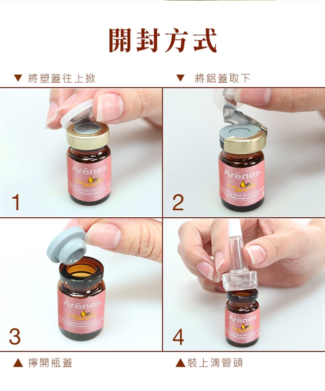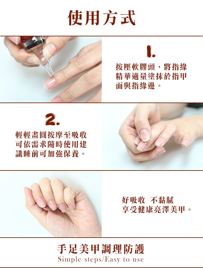 按壓軟膠頭,將指緣精華適量塗抹於指甲面與指緣邊,輕輕畫圓按摩至吸收,可依需求隨時使用,建議睡前可加強保養。