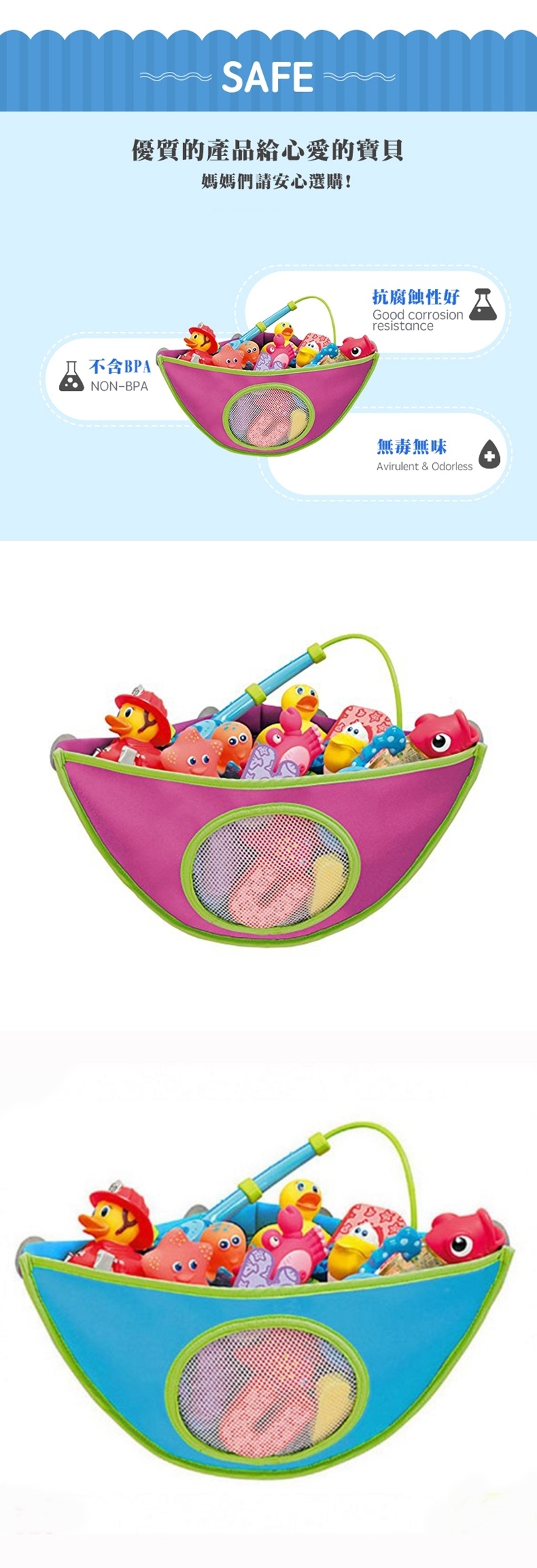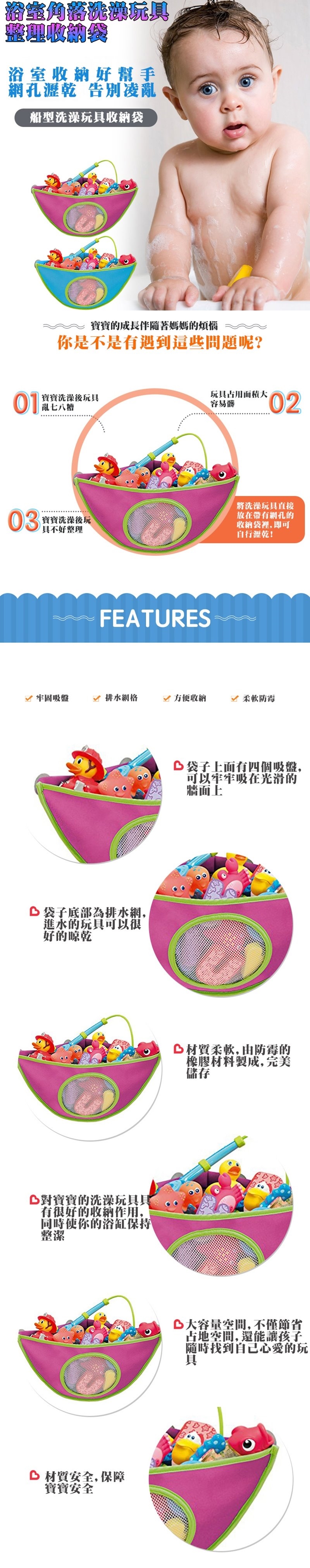 鍛煉寶寶動手能力,洗澡玩具自己收納好。 顏色鮮豔,寶寶的玩具收拾的很規整。袋子上面有吸盤,可以吸住光滑的牆面,袋子底部是排水網,進水的玩具可以很好的晾乾;可以放游泳時孩子在水上玩耍的玩具,可以很好的收納作用,使您的浴缸整潔,玩具也不會丟失。洗澡時間是如此多的樂趣,但是孩子會把洗澡玩具到處扔,真是一個頭疼的問題.現在有了這款收納袋,玩具再也不會丟哦!