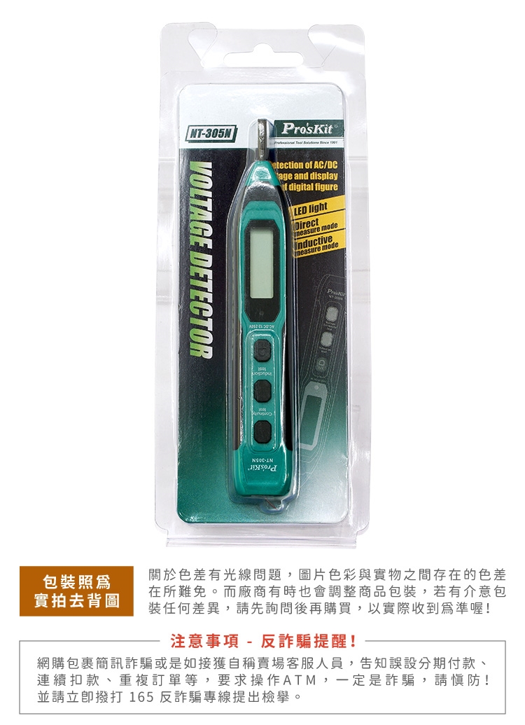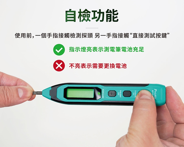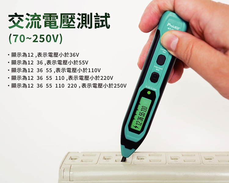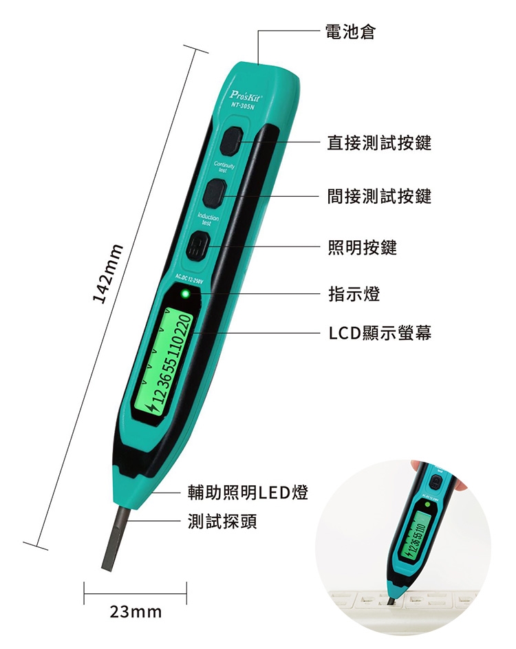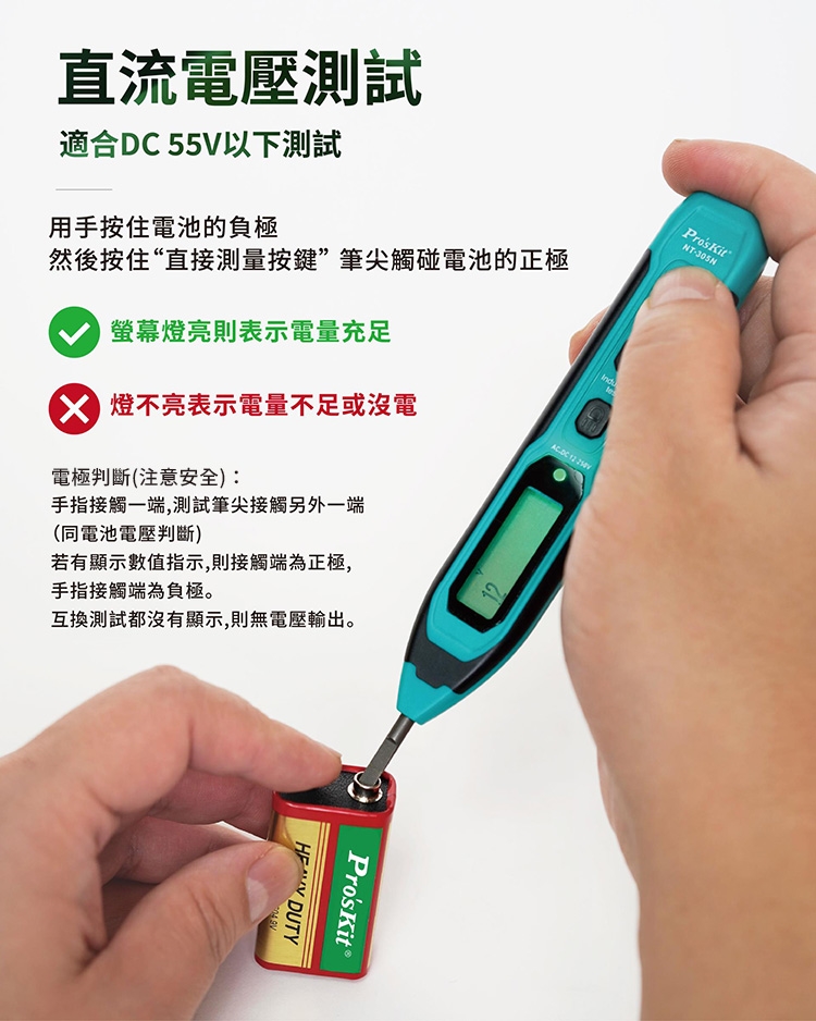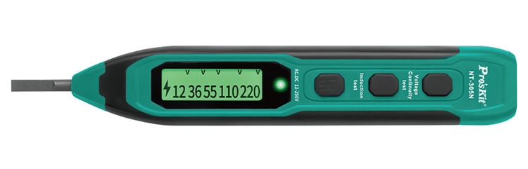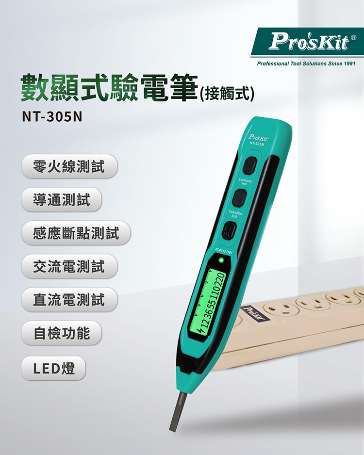 ●【品名】台灣Pro'sKit寶工電子感應接觸式LCD數顯驗電筆NT-305N(筆夾式;測零火線.導通.斷點.交直流電壓.電量)測電筆電工筆
