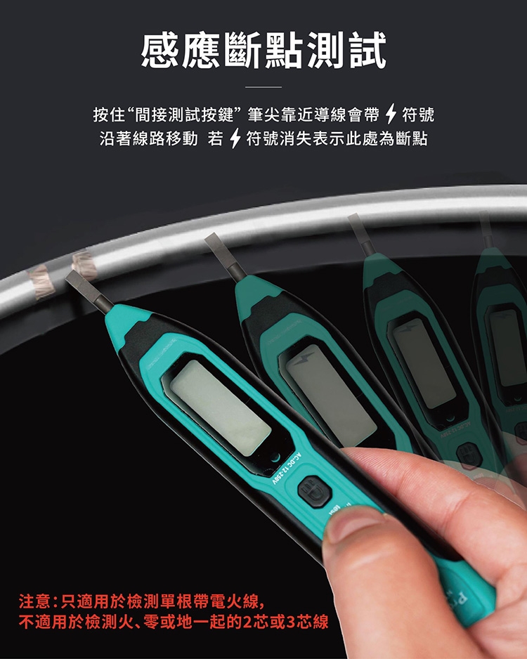 ※注意:只適用於檢測單根帶電火線。不適用於檢測火、零或地一起的2芯或3芯線。