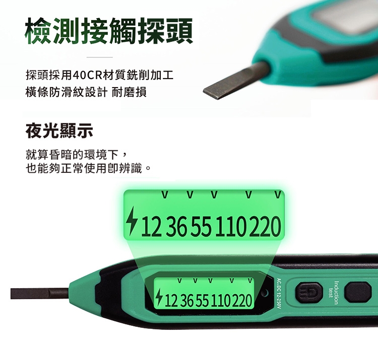 ●接觸探頭採用橫條防滑壓紋設計+40CR材質沖削加工,讓測電更安全。