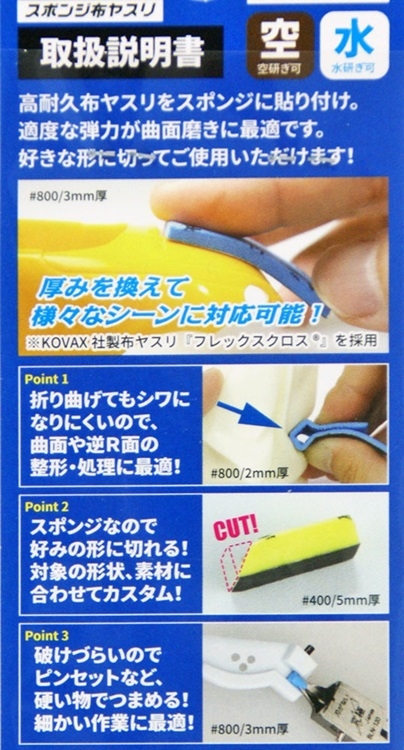 此款海綿紗紙不易破損可以使用其他工具作輔助,在研磨手指無法過度接觸的部件也很方便喔