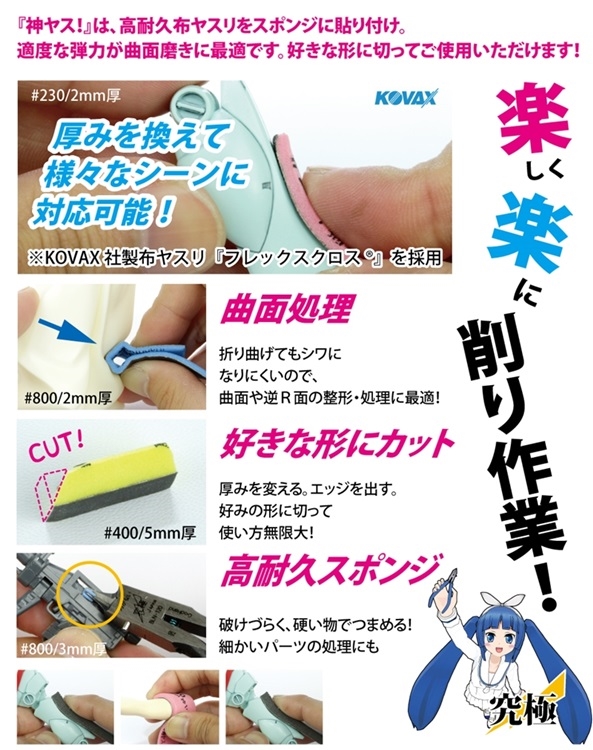 神之手的海綿紗紙選用的材質為KOVAX(鷹牌)所開發的專用布,KOVAX這個品牌是日本開發水砂紙的第一家公司,其專業領域研磨拋光類為主,開發各行各業所需要的研磨材料,不管是汽車美容研磨拋光或是木工部件的研磨都有涉足,其專業性是其他公司無法比擬的,所以在品質上有一定的要求與追求喔