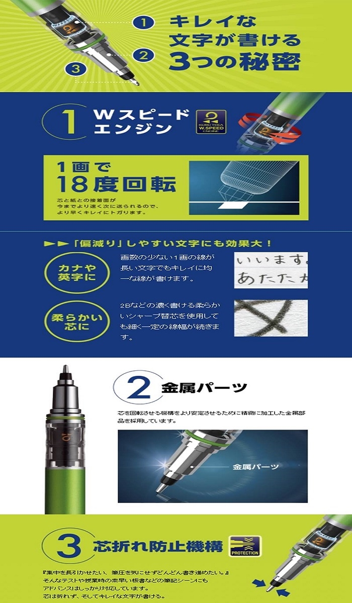 ●(1) 下筆(筆芯接觸紙面)1次就換一次角度(18度),讓筆芯均勻磨損,呈現一樣粗細的字體。(此款商品相較於以前幾代版本,轉速提高2倍,為20轉一圈,書寫更細緻)