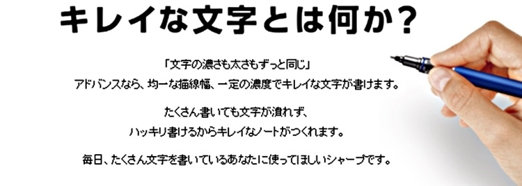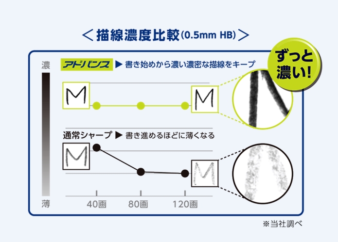 ●書寫效果比較,因能維持筆芯書寫粗細,減少不必要的磨損,所以文字比較不易暈開(碳粉能以一定深度停留在紙張上);一般自動鉛筆書寫時,筆芯角度會越來越斜,因此文字深度會越來越淺(碳粉容易暈開),紙容易髒