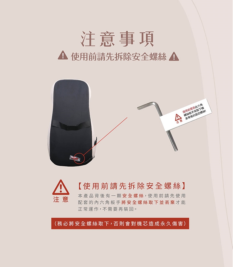 ※注意:椅背附有一顆安全螺絲,第一次使用時請以產品附件的六角板手將安全全螺絲取下,不需再裝回。