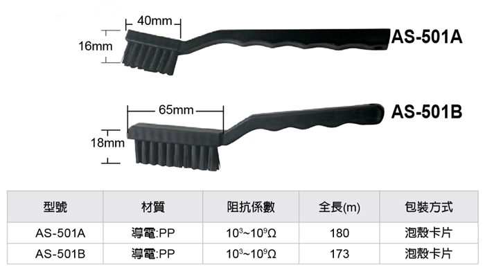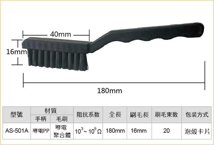 ●【品名】台灣Pro'sKit寶工防靜電毛刷AS-501A小(全長:180mm;刷長:40mm;導電PP;阻抗係數:103~109Ω)抗靜電防靜電刷