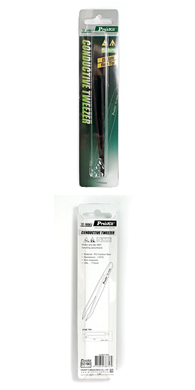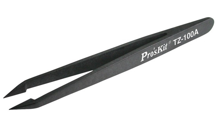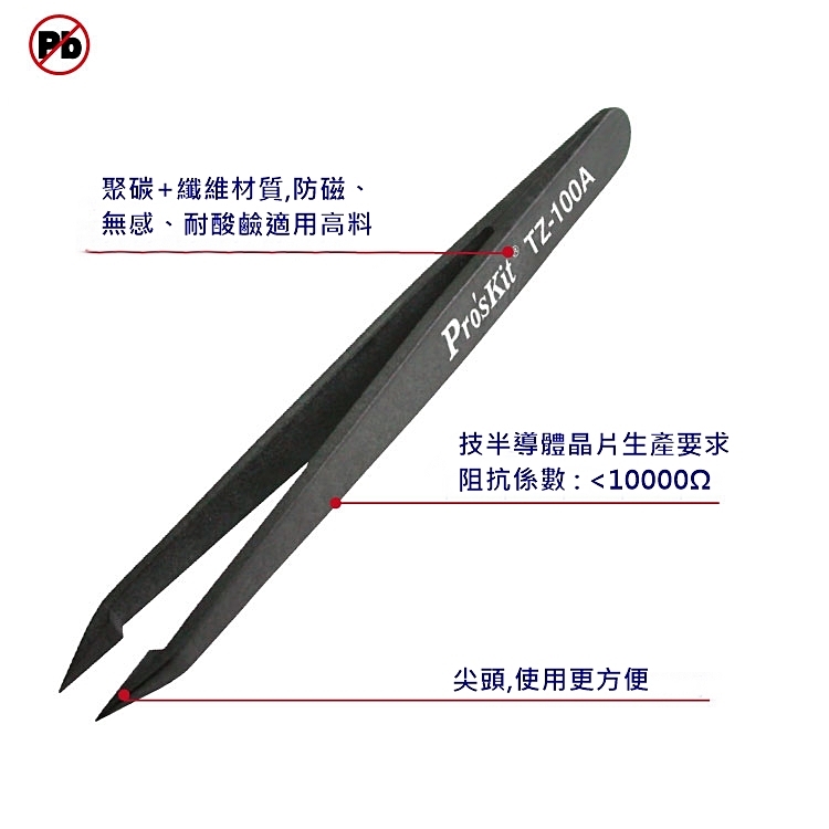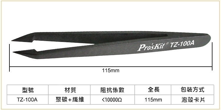 ●【品名】台灣Pro'sKit寶工防靜電纖維特尖鑷子115mm夾子TZ-100A(PC碳纖維導電材質;防磁無感耐酸鹼)抗靜電鑷子 適半導體無塵室夾持電子晶片...等