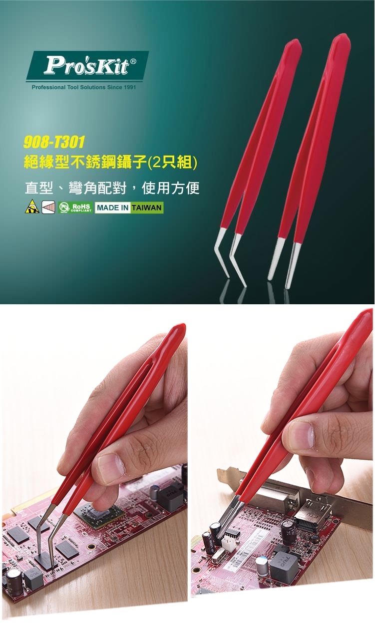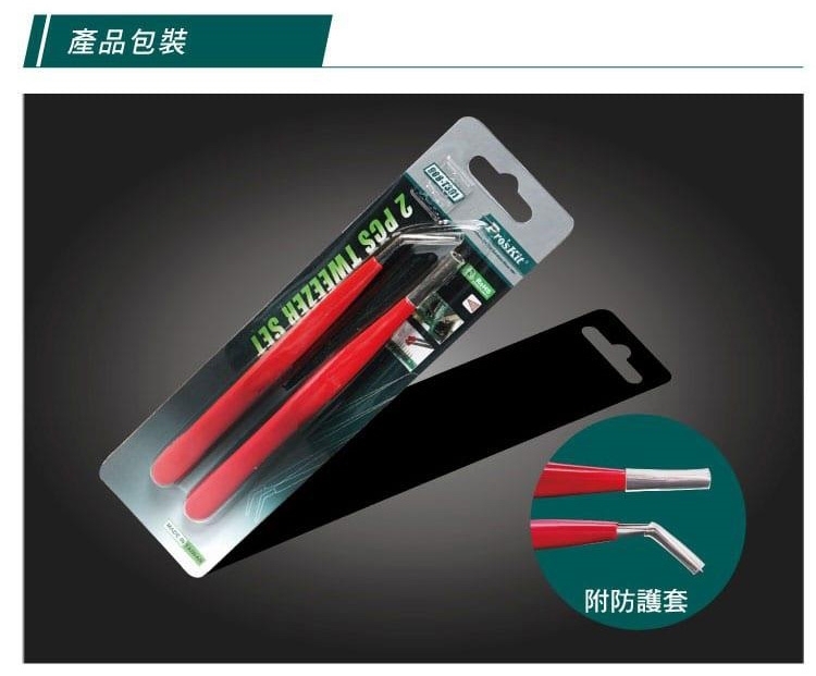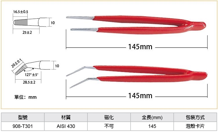 ●【品名】台灣寶工Pro'sKit絕緣型145mm不銹鋼鑷子908-T301(2支組;無磁性AISI304不鏽鋼;前端有牙;附絕緣套柄)