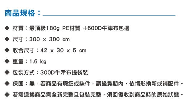商品詳細介紹 使用方法說明 無 注意事項 ◆ 保固:無。若商品有瑕疵或缺件,請鑑賞期內告知,依情形換新或補配件。◆ 若需退換商品需全新完整且包裝完整(含內袋、外箱),亦即須回復至您收到商品時的原始狀態。