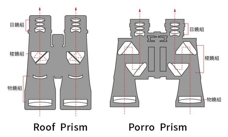 ●"Roof Prism"為望遠鏡的稜鏡反射方式,一般俗稱為屋脊,物鏡與目鏡於同一條直線上,因此使用此反射方式的望遠鏡通常體積較小,不容易發生偏移狀況,使用壽命也較長。