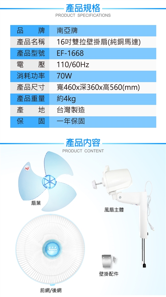 【南亞牌】16吋雙拉壁掛扇EF-1668