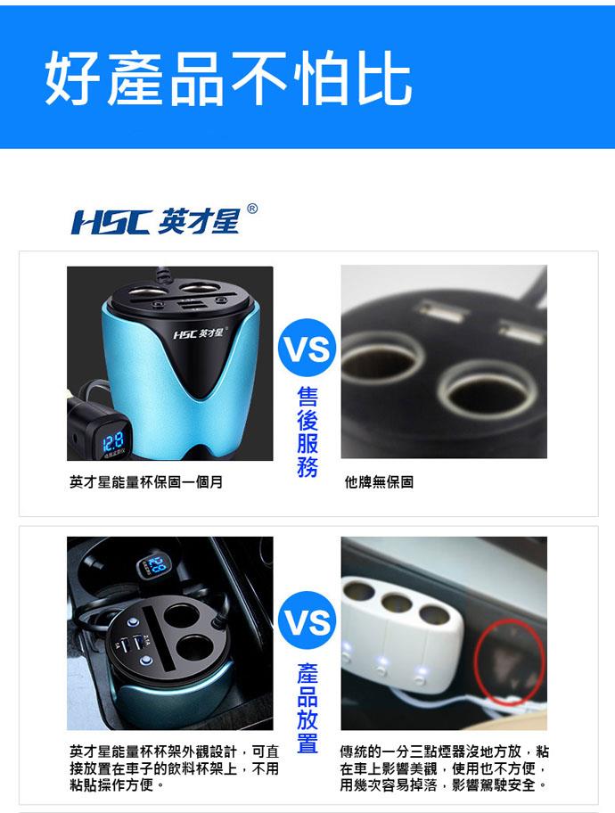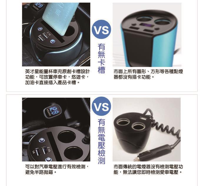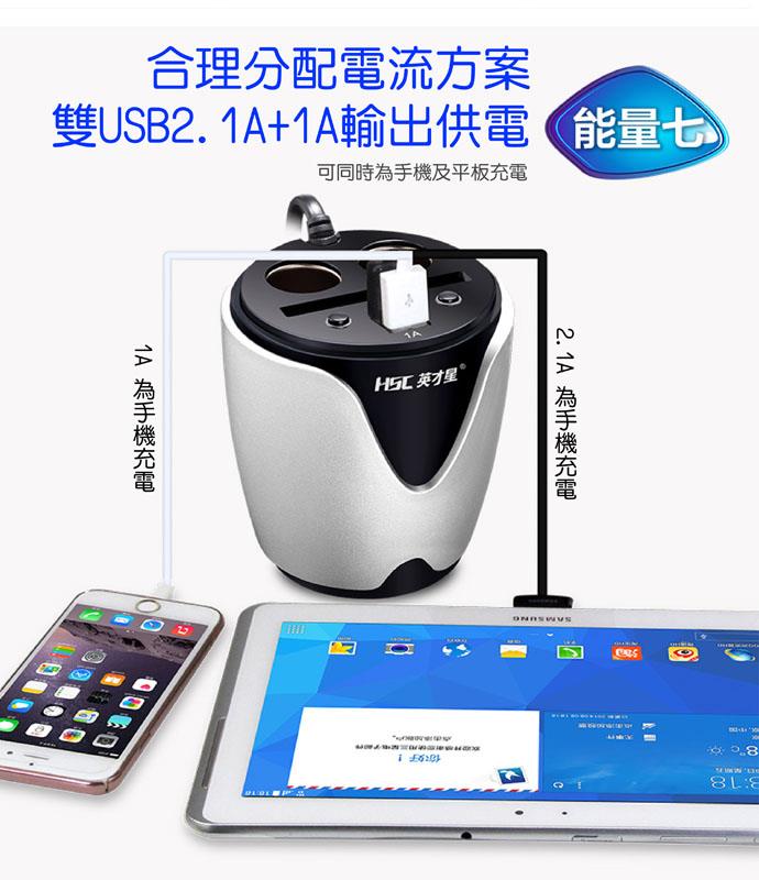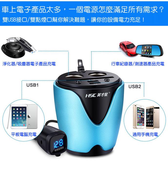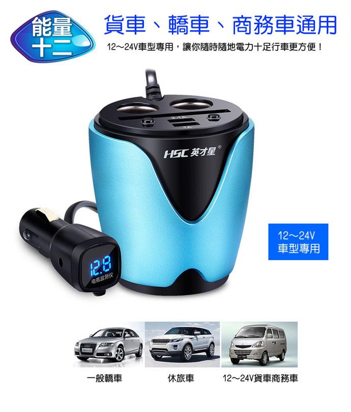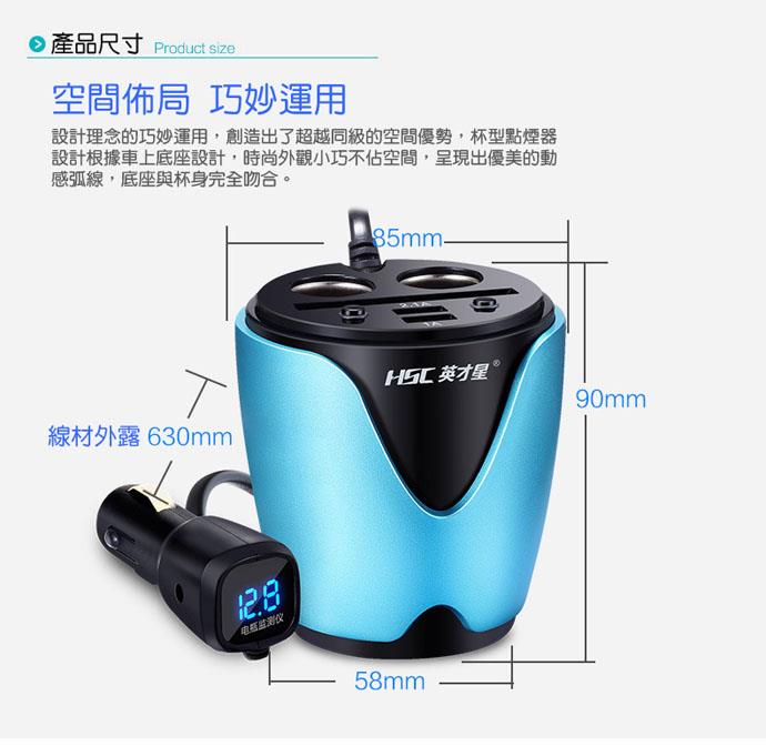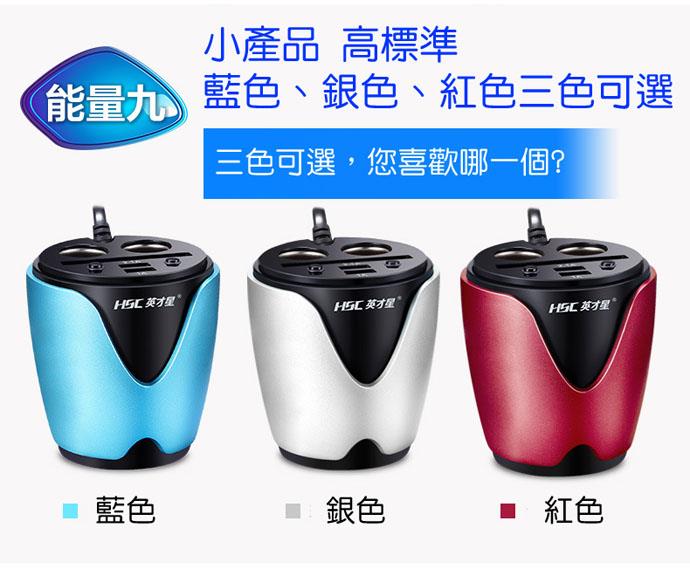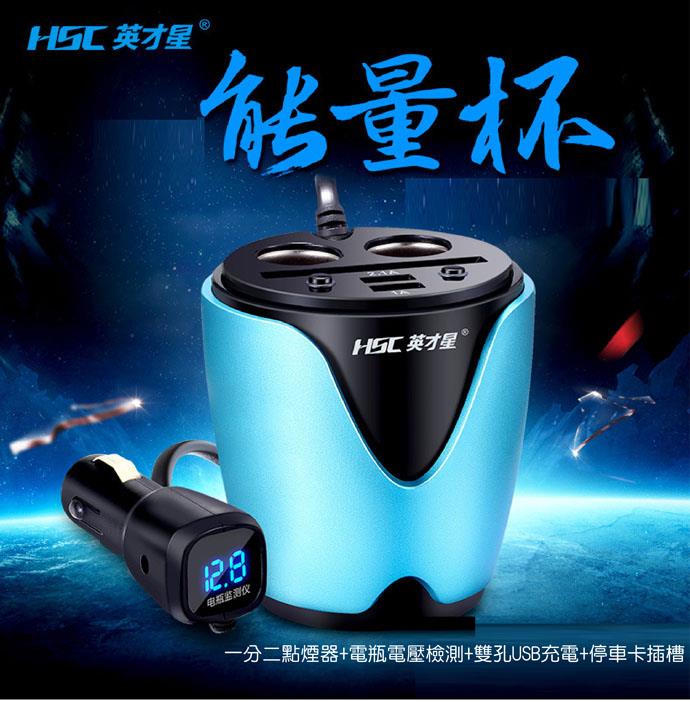 【英才星】HSC-200D車用杯座型電檢擴充器,車杯造型可直接放在杯架上使用,支援12~24V,任何車種皆可使用!磨砂烤漆打造時尚金屬質感,貼心附卡槽,可放停車卡、悠遊卡等,多種接孔,一機解決手機、平板、行車紀錄器等充電插槽,三色超值任君挑選!