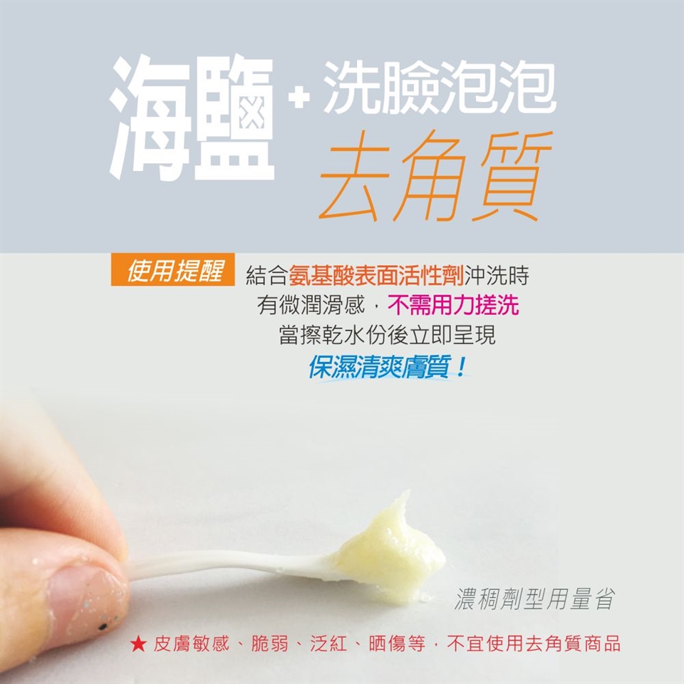 優勢:結合海鹽與優質界面活性劑,去除粗糙角質,洗後保濕又清爽