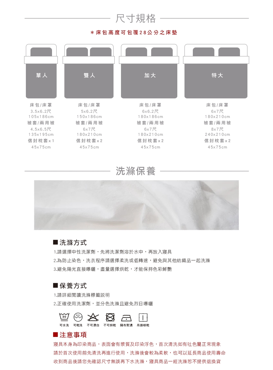 ◎建議清洗時,先將洗劑溶解於水中,再將床寢放入大型洗衣袋後再清洗