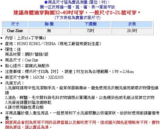 商品詳細介紹 期待了一整天的浪漫時光要以性感誘人的鮮紅色~還是俏麗可人的螢光黃來為今晚揭開浪漫序章呢?美麗的柔紗輕盈飄逸~隱約透出肌膚誘惑破表運用蕾絲滾邊點綴的深V線~讓美麗酥胸視覺上更顯豐滿挑逗著他所有視覺感官! 使用方法說明 無 注意事項 如商品詳細說明