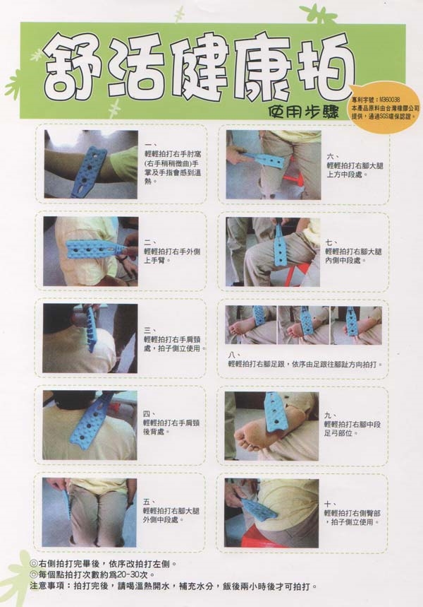 舒活健康拍【小】台灣製造 專利產品 特殊矽膠製造,不易折斷。 超省力彈力設計,握把掌心舒適,拍打按摩力道適中。 表面凸起設計,可對於肩頸、背部、關節、腳底等拍打按摩,舒緩不適。 |