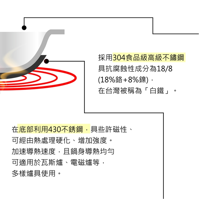 3.為保持鍋具品質,使用瓦斯爐加熱時,爐火請勿超出鍋底邊緣。