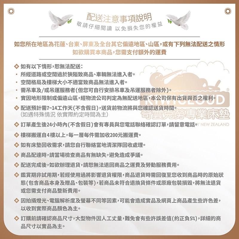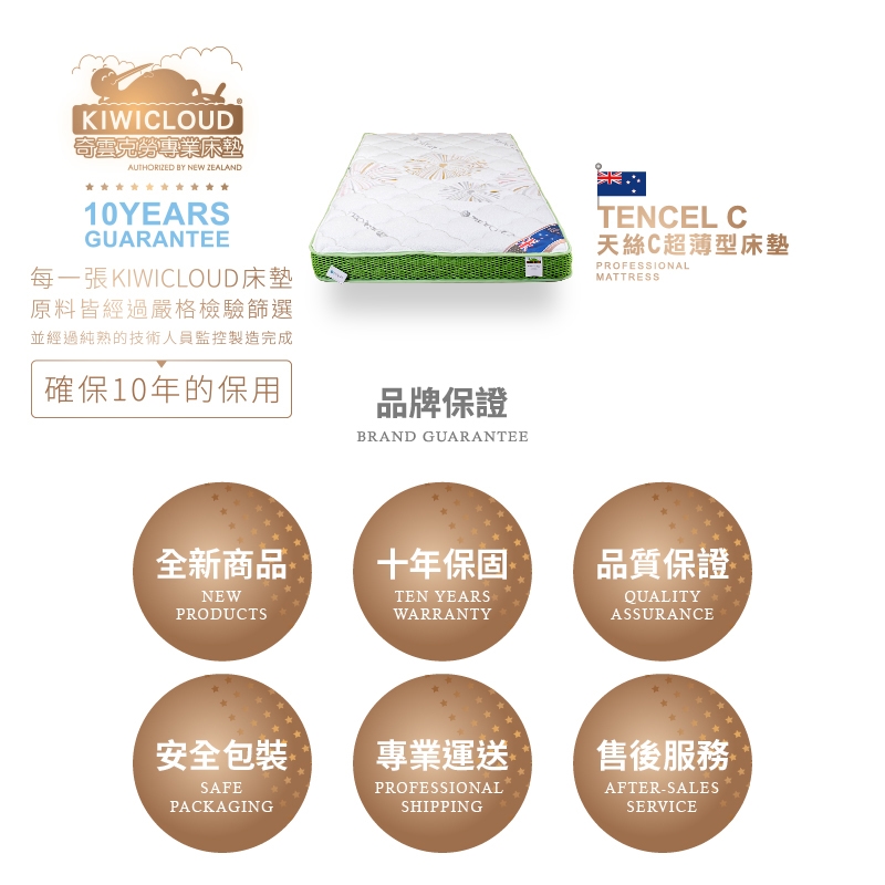 全系列床墊皆享有10年保固,給您最超值的專人售後服務,每張床墊皆擁有專屬出廠身份證,保證全新商品,採用防水PVC膜及防磨厚牛皮紙的獨立防護包裝,免運費專人運送到府服務!