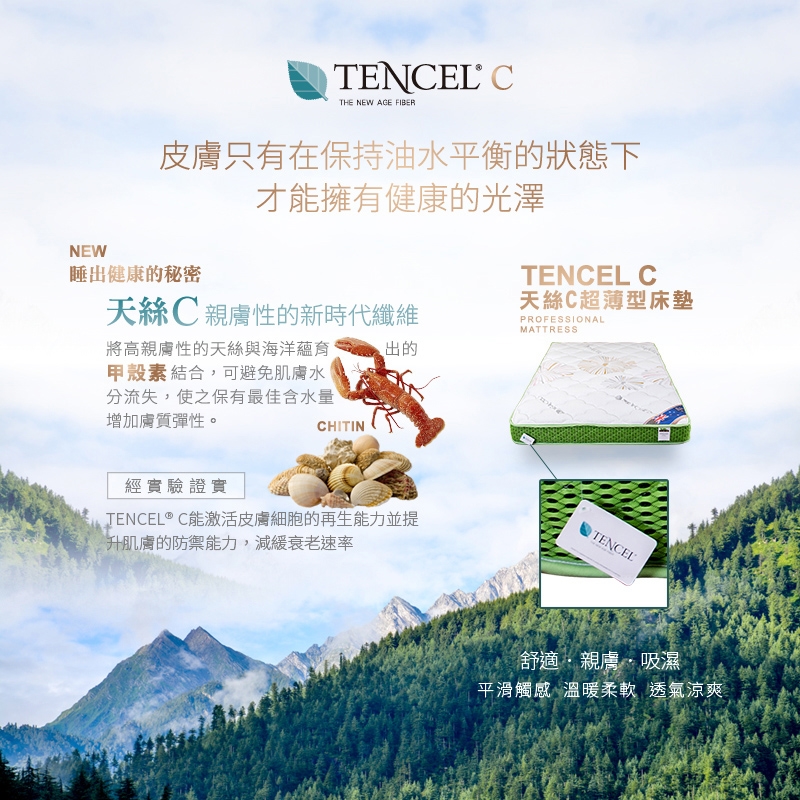 親膚性的新時代纖維,將高親膚性的100%天然植物性纖維與海洋蘊育出的甲殼素結合,有效保持肌膚天然溼度,睡眠中不易流失水分,絕佳的透氣特性更能抑制減少細菌的生長。