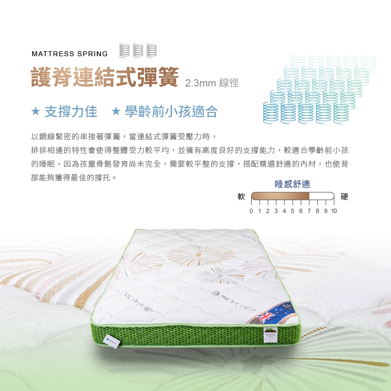 護脊連結式彈簧是以鋼線緊密的串接著彈簧,當連結式彈簧受壓力時,排排相連的特性會使得整體受力較平均,並擁有高度良好的支撐能力,較適合學齡前小孩的睡眠,因為孩童骨骼發育尚未完全,需要較平整的支撐,搭配精選舒適的內材,也使背部能夠獲得最佳的撐托。