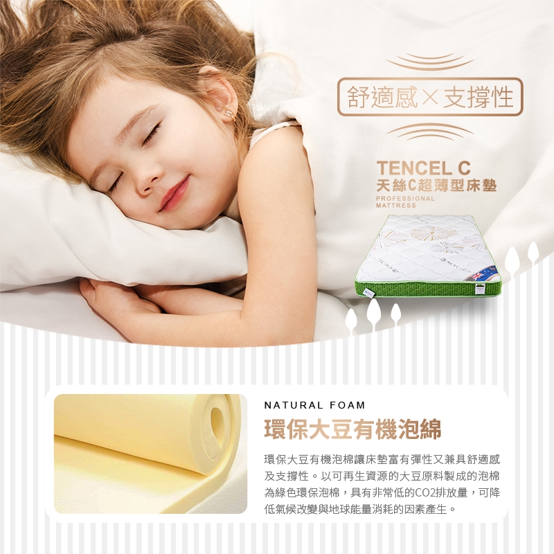 環保大豆有機泡棉讓床墊富有彈性又兼具舒適感及支撐性。以可再生資源的大豆原料製成的泡棉為綠色環保泡棉,具有非常低的CO2排放量,可降低氣候改變與地球能量消耗的因素產生。