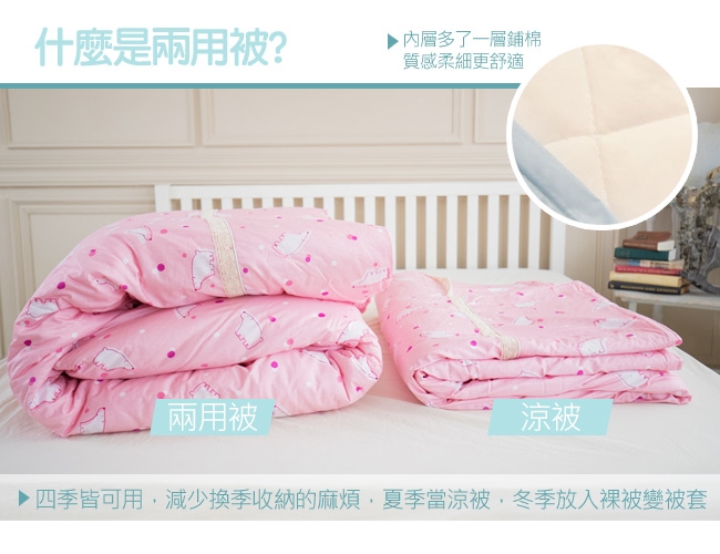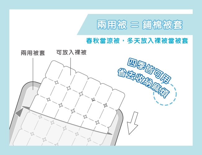 兩用涼被 開拉側邊大拉鍊 可於冬天放入棉被使用,一年四季均可使用。
