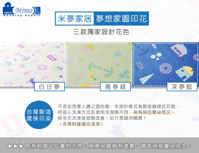 台灣製作,環保染印,不添加危害人體之固色劑,不易起毛球,讓您睡得舒適又安心!