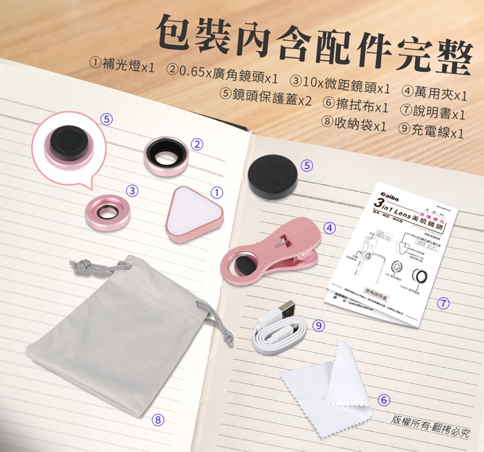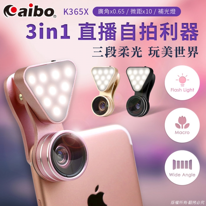 aibo K365X 廣角/微距/補光燈三合一 直播補光美肌鏡頭組