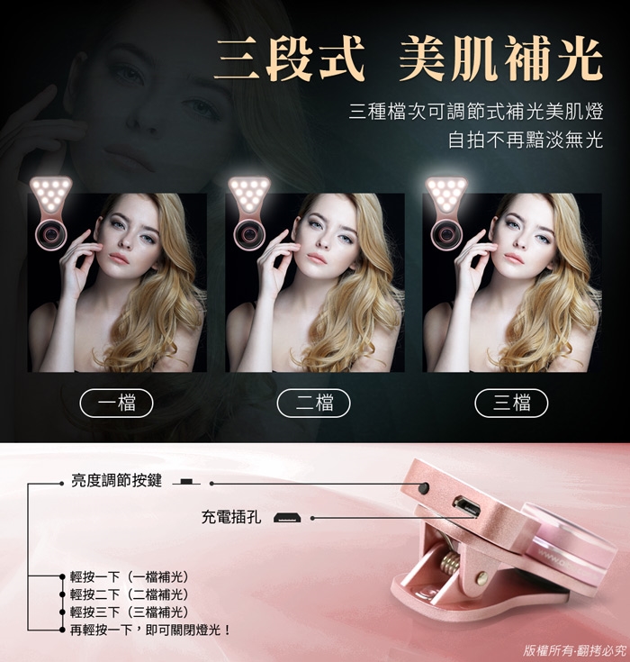 補光燈可三段式調節亮度,可充電重複使用,不須更換電池,