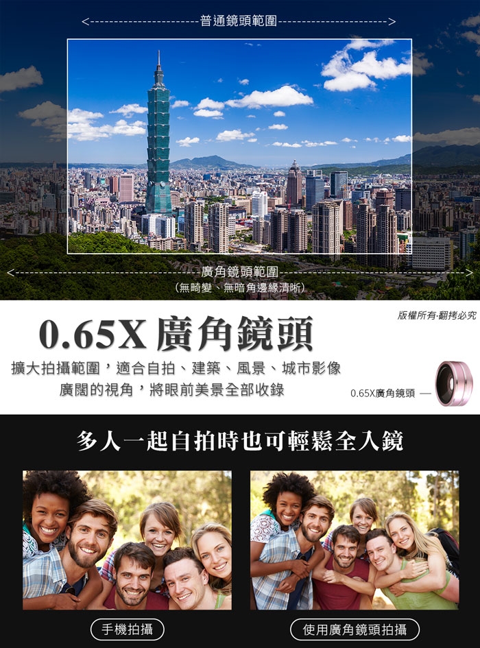 0.65倍廣角鏡頭,多人一起自拍時也可輕鬆全入鏡,外出旅遊,